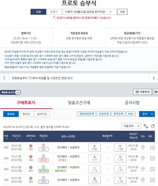 NBA 플레이오프 파이널 6차전 인디애나(홈)-오클라호마(원정)전을 대상으로 하는 프로토 승부식 73회차의 상세 분석 및 구매 정보는 공식 인터넷 발매사이트 ‘베트맨’ 토토가이드에서 확인하면 된다.