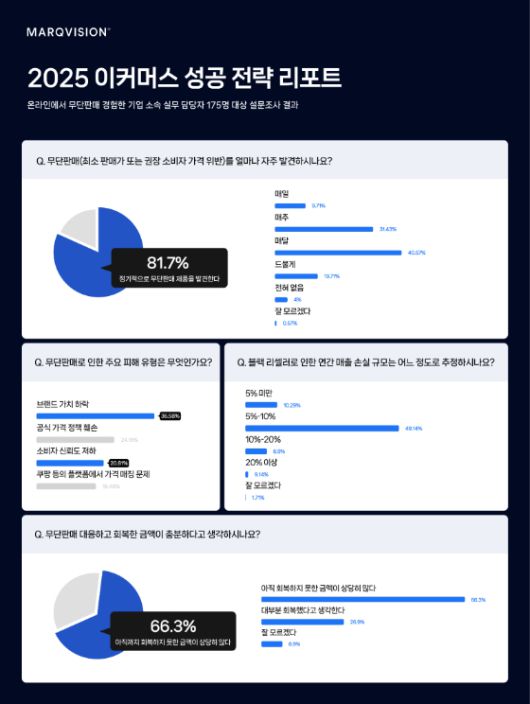 이번 리포트는 온라인에서 실제로 무단판매 사례를 경험한 기업 실무 담당자 175명을 대상으로 진행한 심층 설문조사 결과를 바탕으로 무단판매 발생 빈도와 피해 규모, 대응 전략 등을 다각도로 분석했다.
