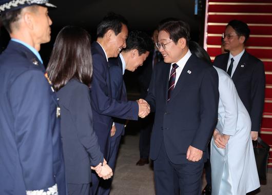 주요 7개국(G7) 정상회의 참석을 마치고 19일 경기 성남 서울공항을 통해 입국한 이재명 대통령이 영접나온 우상호 정무수석과 인사하고 있다. 김현동 기자
