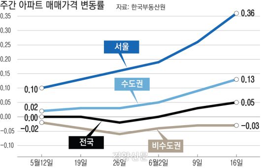 한국부동산원이 19일 발표한 6월 셋째주(16일 기준) 주간 아파트 가격 동향 조사 결과, 서울 아파트 매매가는 한 주간 0.36% 오르며 전주(0.26%)보다 상승폭이 커졌다. 주간 단위로 비교하면 문재인 정부 때인 2018년 9월 둘째주(0.45%) 이후 최대 상승폭이다.