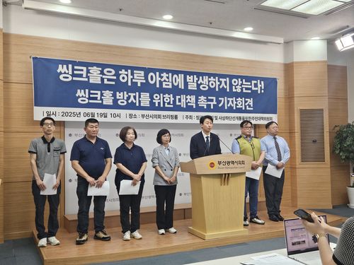 (부산=연합뉴스) 김선호 기자 = 부산 사상∼하단선 안전 개통을 위한 사상주민대책위원회는 19일 부산시의회에서 기자회견을 열고 부산시에 땅 꺼짐 현상 재발 방지 대책을 요구했다.