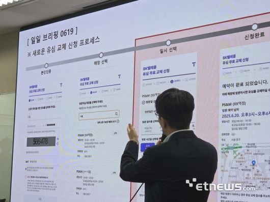 임봉호 SK텔레콤 MNO사업부장 부사장이 19일 서울 을지로 삼화타워에서 열린 브리핑에서 20일부터 도입되는 새로운 유심 교체 예약 시스템에 대해 설명하고 있다. |