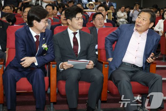 (서울=뉴스1) 이광호 기자 = 김용태 국민의힘 비상대책위원장(가운데)과 조경태(왼쪽),이철규 의원이 19일 오후 서울 여의도 국회 의원회관에서 열린 '체코 원전수주의 의미와 우리 원전 산업계의 나아갈 방향' 정책토론회에 참석해 대화하고 있다. 2025.6.19/뉴스1