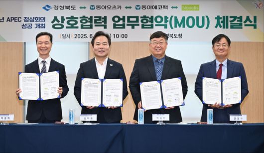 동아오츠카는 지난 18일 경북도청에서 경상북도, 노벨리스코리아, 동아에코팩과 함께 2025년 아시아태평양경제협력체(APEC) 정상회의의 성공적 개최와 자원 순환 기반의 지속 가능한 지역경제 성장을 위한 업무협약을 체결했다고 19일 밝혔다.