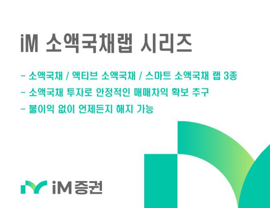 iM 소액국채 랩은 소액국채 투자를 통해 시중금리 보다 높은 성과를 추구하는 일임형 상품으로 ‘소액국채 랩’, ‘액티브 소액국채 랩’, ‘스마트 소액국채 랩’ 등 3종으로 운영된다.