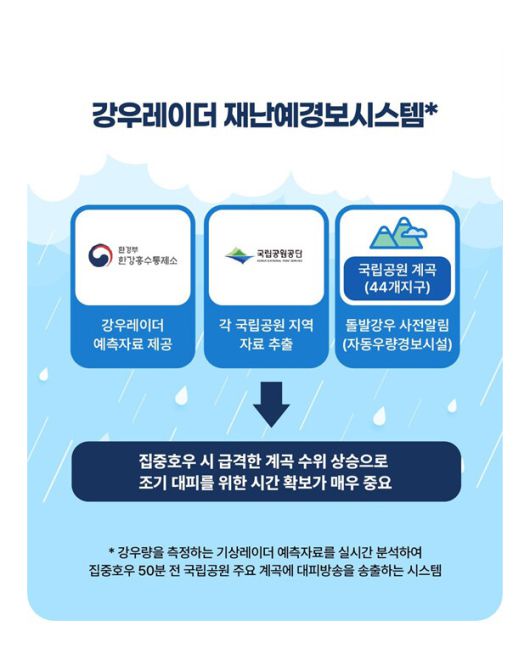 먼저 정부는 집중호우 예상 50분 전 대피 방송을 송출하는 ‘강우레이더 재난예경보시스템’을 기존 지리산 한 곳에서 설악산, 월악산, 북한산 등 전국 산악형 국립공원 17곳(44개 지구)으로 확대해 이달 13일부터 운영하고 있다고 밝혔다. 강우레이터 재난예경보시스템은 실시간으로 강우를 계측·기록하다, 해당 계곡마다 설정해 놓은 위험치(0.5m, 0.7m, 1.0m)만큼 비가 오면 경보시설(스피커)을 통해 최대 3차례 “대피하라”는 안내 방송을 내보내는 시스템이다.