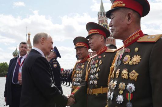 블라디미르 푸틴 러시아 대통령이 지난 5월 북한군들과 악수하고 있다. [사진=연합뉴스] |