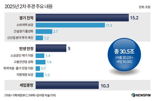 [세종=뉴스핌] 백승은 기자 = 이재명 정부 출범 20일만에 30조5000억원 규모의 추가경정예산(추경)이 추가 추입된다. 경기진작·민생 안정을 위한 지출을 20조2000억원 확대하고, 세입경정 10조3000억원을 반영했다.