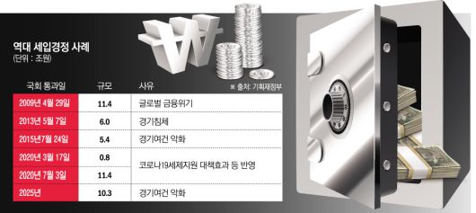 이번 경정 규모는 글로벌 금융위기 시기인 2009년 11조4000억 원(본예산 대비 -6.5%), 코로나19 시기인 2020년 7월 11조4000억 원(-4.2%) 이후 역대 세 번째다. 10조3000억 원은 올해 본예산 대비 -2.7% 수준으로 경기 여건이 그만큼 엄중하다는 판단으로 풀이된다.