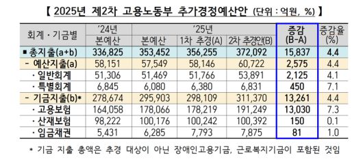 먼저 최근 건설업·제조업 중심으로 실업급여 수급인원이 증가하는 만큼, 실업급여 예산을 1조 2929억원 보강했다. 이로써 19만 7000명 늘어난 179만 8000명이 실업급여를 받을 수 있게 됐다.