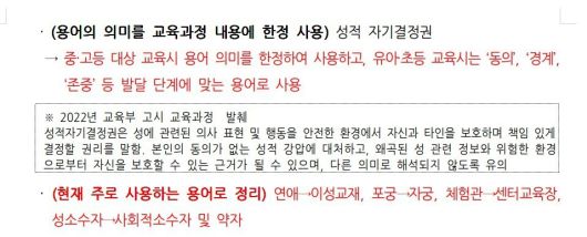서울시는 이 밖에도 ‘연애’는 ‘이성교제’로, ‘포궁’은 ‘자궁’으로, ‘성소수자’는 ‘사회적 소수자 및 약자’로 대체하도록 했다. 또 ‘성적 자기결정권’이라는 표현은 중·고등학생 교육에서만 제한적으로 사용하고, 유아·초등학생 교육에서는 ‘동의’, ‘경계’, ‘존중’ 등으로 표현을 바꾸라고 했다. 이는 성적 자기결정권이라는 용어를 성관계 거절의 의미에서만 사용하도록 한다는 뜻이다.