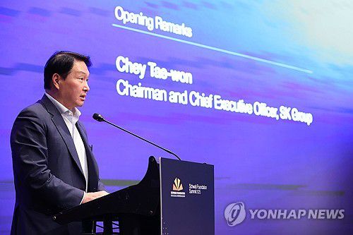 (서울=연합뉴스) 최태원 SK 회장이 19일 서울 여의도 콘래드 호텔에서 열린 세계경제포럼 슈왑재단 총회에서 발언하고 있다. 2025.6.19 [사회적가치연구원 제공. 재판매 및 DB 금지]