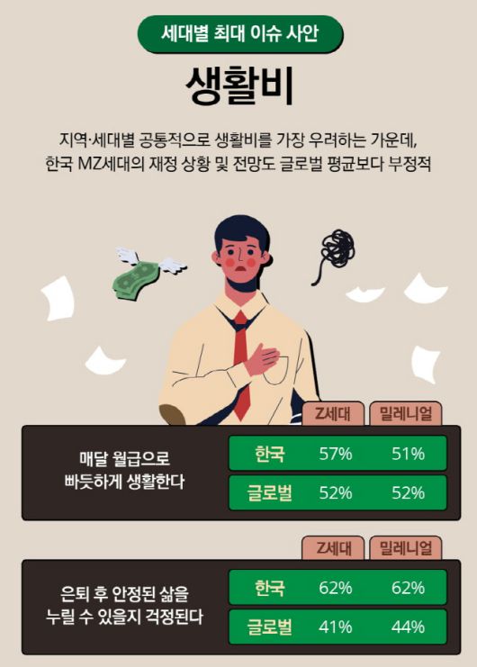Z세대(36%)와 밀레니얼(33%) 모두 가장 큰 걱정거리로 '생활비'를, 다음으로 '경제 성장'(각각 29%, 31%)을 꼽았다. 개인의 재정 안정성과 관련해 Z세대 57%, 밀레니얼 51%는 '월급으로 빠듯하게 산다'고 답했고, Z세대 46%, 밀레니얼 43%는 매달 생활비 지출에 어려움을 겪고 있는 것으로 나타났다.