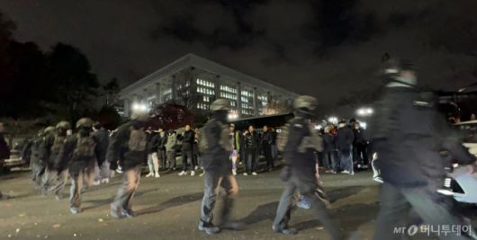 윤석열 대통령의 비상계엄 해제 요구 결의안이 국회 본회의에서 통과된 지난해 12월4일 새벽 무장 계엄군이 국회를 나서고 있다. 여야는 이날 본회의에서 재석 190명 중 찬성 190명으로 비상계엄 해제 요구 결의안을 가결 처리했다. / 사진=뉴스1 |