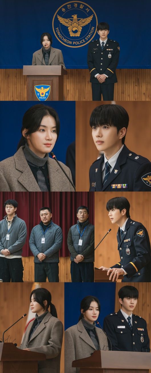 이 가운데 공개된 스틸은 긴급 언론 브리핑에 나선 세현과 정현의 모습을 포착해 이목을 집중시킨다. 두 사람이 뿜어내는 극과 극의 카리스마가 만들어내는 시너지가 기대감을 최고조로 끌어올리는 것. 먼저 용천서 신임 강력팀장 정현은 각 잡힌 경찰 정복을 완벽하게 소화해낸 훈훈한 제복핏으로 단숨에 눈길을 사로잡는다. 훤칠한 키와 다부진 체격, 그리고 팀장으로서의 막중한 책임감이 느껴지는 강직한 눈빛은 불의와 타협하지 않는 정현의 성격을 고스란히 드러낸다.