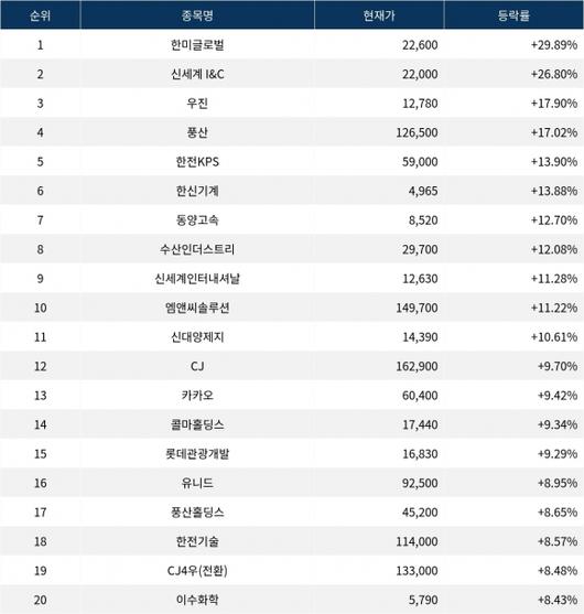 이어 상승률 2위 신세계 I&C(035510)(035510)는 주가가 +26.80% 폭등하며 종가 22,000원에 상승 마감했다. 상승률 3위 우진(105840)(105840)의 주가는 12,780원으로 +17.90% 급등하며 부진했다. 상승률 4위 풍산(103140)(103140)은 +17.02% 급등하며 126,500원에 마감했다. 상승률 5위 한전KPS(051600)(051600)는 +13.90%의 상승세를 타고 종가 59,000원에 마감했다.