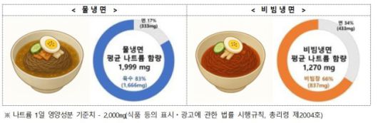 제품 유형별로는 물냉면 5종의 평균 나트륨 함량이 1999㎎으로, 비빔냉면(1270㎎)보다 높았다. 나트륨의 주요 공급원은 육수(물냉면)의 경우 전체 함량의 83%, 비빔장(비빔냉면)은 66%를 차지했다. 소비자원은 이에 대해 "간편식 냉면을 먹을 때 나트륨 섭취를 줄이기 위해 육수와 비빔장의 양을 조절할 필요가 있다"고 권고했다.