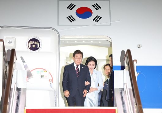 이재명 대통령과 김혜경 여사가 19일 51차 주요 7개국(G7) 정상회의 일정을 마친 뒤 성남 서울공항에 도착해 공군 1호기에서 내리고 있다. [연합] |