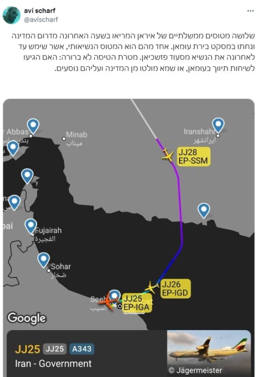 이스라엘 매체 하아레츠의 국가안보 전문 저널리스트인 아비 샤르프는 같은 날 자신의 X(옛 트위터)에 항공기 경로 추적 사이트 캡처 이미지를 공유하며 "이란의 정부 소속 항공기 3대가 최근 1시간 이내에 남부 지역에서 이륙해 오만의 수도 마스카트에 착륙했다"고 밝혔다.