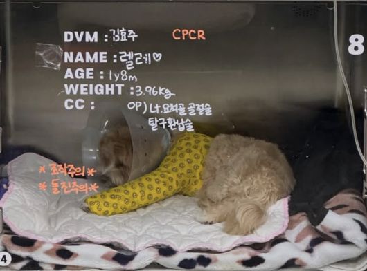 19일 한예슬은 "렐레(반려견)가 수술을 잘 마치고 현재 입원 중입니다"라며 수술 후 깁스를 하고 입원 중인 반려견의 모습을 공개했다.