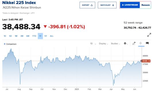 블룸버그통신에 따르면 일본증시 닛케이225지수는 전장보다 396.81포인트(1.02%) 하락한 3만8488.34에, 기술주 중심의 토픽스지수는 전장 대비 16.27포인트(0.58%) 내린 2792.08에 각각 장을 마감했다.