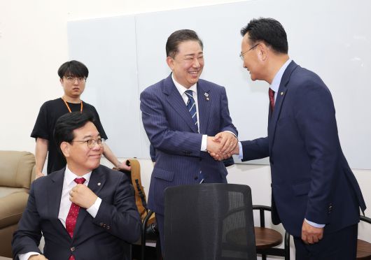 김병기 더불어민주당 당대표 직무대행 겸 원내대표가 18일 추경안 관련 논의를 위해 국회 민주당 원내대표실을 찾은 송언석 국민의힘 원내대표와 유상범 의원을 맞이하고 있다. [연합] |
