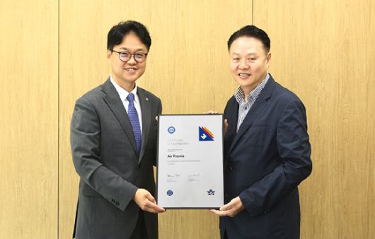 6월19일 오후 에어프레미아 본사 대회의실에서 열린 인증서 수여식에는 김백재 IATA 한국지사장이 참석해, 임직원들과 함께한 자리에서 유명섭 에어프레미아 대표에게 인증서를 직접 전달했다.