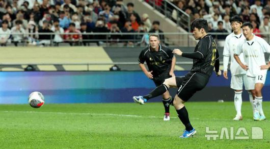 [서울=뉴시스] 추상철 기자 = 20일 오후 서울 마포구 서울월드컵경기장에서 열린 '2024 넥슨 아이콘매치' FC스피어(공격수팀)와 실드 유나이티드(수비수팀)의 경기, FC스피어 박지성이 페널티킥을 하고 있다. 2024.10.20. scchoo@newsis.com |