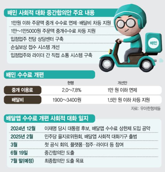 이 외에도 우아한형제들은 △입점업주 전담 상담센터 구축 △손실보상 접수 시스템 개선 △입점업주와 라이더 간 직접 소통 시스템 구축 등에 3년간 총 3000억 원을 투입할 계획이다. 업계의 한 관계자는 “윤 정부 때 도입한 상생요금제도 상당한 진통 끝에 나온 만큼 이번 합의도 논의를 마칠 때까지 지켜봐야 한다”고 전했다. 민주당과 배달업계는 7월 말까지 논의 후 최종합의안을 도출할 계획이다.