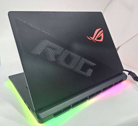 얼핏 보기에 디자인이 아주 간결해 보이는데, 실제로 이용해보면 여기저기에서 상당한 개성이 드러나는 것을 알 수 있다. 특히 노트북 하단 주변을 다양한 색으로 빛나게 하는 ‘풀서라운드 RGB 라이트바’, 그리고 노트북 상판에 RGB LED 기반의 ROG 로고를 단 것이 눈길을 끈다.