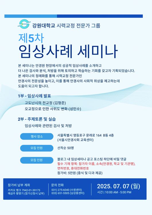 강원대학교 시력교정 전문가 그룹이 내달 7일 제5차 임상사례 세미나에 참가할 안경사 50명을 선착순으로 모집한다.