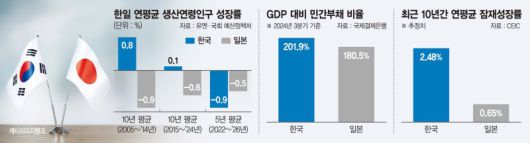 한국은행도 최근 발표한 '일본 경제로부터 되새겨볼 교훈' 보고서에서 "한국 경제가 일본의 전철을 밟고 있다"고 평가했다. 민간부채 비율은 2023년 기준 GDP 대비 207.4%로, 일본 버블기 최고치(214.2%)에 근접했고 과도한 자산시장 연계대출은 자원배분 왜곡과 금융시스템 불안으로 이어질 수 있다고 했다. 한은도 예정처와 마찬가지로 생산연령인구 감소가 성장잠재력을 떨어뜨릴 요인으로 꼽았다.