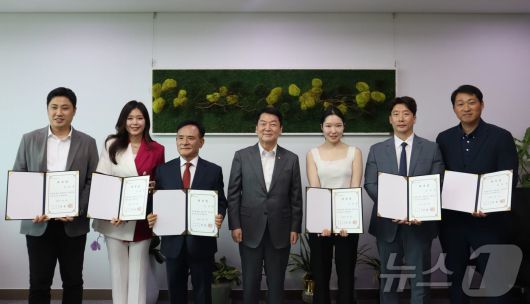(서울=뉴스1) = 안철수 국민의힘 의원이 19일 서울 여의도 국회의원회관 의원실에서 특별보좌관 임명 후 기념 촬영하고 있다. 왼쪽부터 왼쪽부터 송경택 특보, 이효진 특보, 김석균 특보, 안 의원, 신나리 특보, 노지만 특보, 정주영 특보. (안철수 의원실 제공. 재판매 및 DB 금지) 2025.6.19/뉴스1