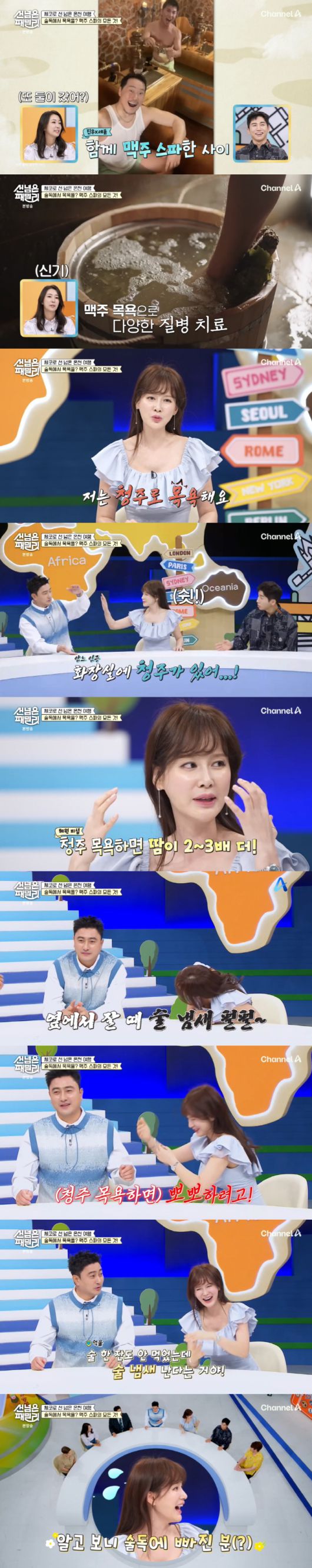 이혜원은 자신만의 플렉스 목욕에 대해 "예전에 제사를 지내고 나면 큰 게 남지 않나. 물에다가 남은 정종을 넣고 목욕하면 땀이 2~3배 더 난다"며 "생각해보면 정종이 쌀로 만든거고 하얘지지 않냐"라며 장점을 설명했다.