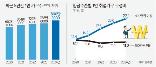 1인가구 내 소득 격차는 갈수록 벌어지고 있다. 월 소득 400만원 이상 1인 임금근로자 가구 비중은 2020년 12.4%에서 지난해 22.1%로 5년 새 9.7%포인트나 급증했다. 반면 월 소득 100만원 미만 저소득 1인가구 비중은 2020년 12.1%에서 지난해 11.2%로 소폭 감소해 사실상 정체 상태를 보였다. 200만∼300만원 미만 중위소득 구간도 2023년 34.0%에서 2024년 31.9%로 줄어들었다. 고소득 1인가구는 지속적으로 늘어나는 반면 저소득층 1인가구는 여전히 경제적 어려움에서 벗어나지 못했다.