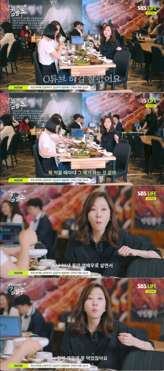 열심히 먹방을 하던 김남주는 “너튜브 하길 잘했어. 지난 31년 동안 여배우로 살면서 촬영 때문에 못 먹었다. 근데 촬영하면서 이렇게 먹으니까 어색하네?”라고 밝혔다. 김남주는 “나이스”라며 기분 좋은 표정을 지었다.