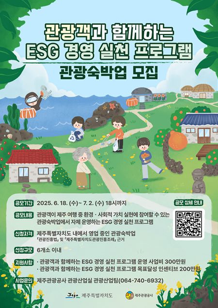 (제주=국제뉴스) 문서현 기자 =제주도와 제주관광공사는 지속 가능한 제주 관광을 위해 오는 7월 2일까지 '관광객과 함께하는 ESG(환경·사회·지배구조) 경영 실천 프로그램'을 운영할 도내 관광숙박업체를 모집한다.