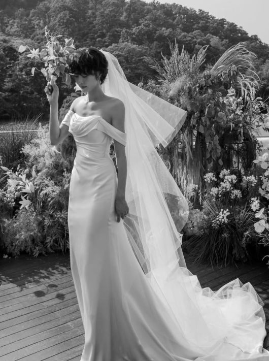 사진 속 최여진은 어깨가 드러난 실크 소재 머메이드 웨딩 드레스를 입고 우아한 실루엣으로 눈길을 끈다.