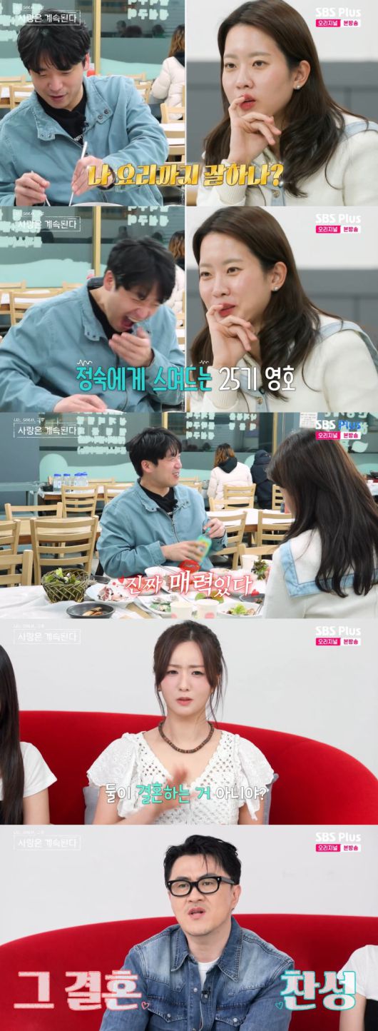 이어 25기 영호는 "배우자 되실 분이 요리를 잘하면 좋긴 한데 못해도 된다. 요즘은 밀키트도 잘 나와서 못 해도 된다"고 말했고, 24기 정숙이 "하실 생각은 있냐"며 요리 실력을 묻자 "저 먹는 건 한다. 누굴 대접해준적은 그렇게 많진 않다"고 답했다.