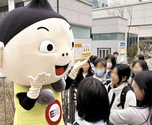 지난 3월 세종시의 한 초등학교 앞에서 간호사 길모씨가 인근 학원 캐릭터 옷을 입고 홍보 전단을 나눠주고 있다. /독자 제공 |