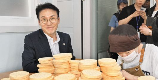 발달장애인 작업 현장 찾은 김민석 총리 후보 - 김민석 국무총리 후보자가 19일 서울 영등포구 신길동‘꿈더하기 사회적 협동조합’에서 발달장애인 근로자들이 스펀지를 만드는 작업 현장을 살펴보고 있다. /고운호 기자 |