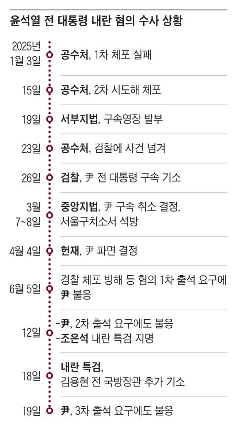 내란 혐의 등으로 구속됐다가 법원의 구속 취소 결정으로 지난 3월 풀려난 윤석열 전 대통령을 다시 구속하기 위한 수사가 속도를 내고 있다. 경찰은 19일 윤 전 대통령이 세 번째 출석 요구에 불응하자, ‘내란 특검팀’과 윤 전 대통령에 대한 체포 영장 신청 등을 협의했다. 누가 하든지 강제 연행에 나서겠다는 것으로 풀이된다.