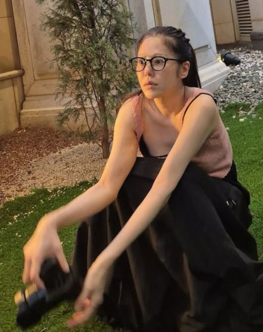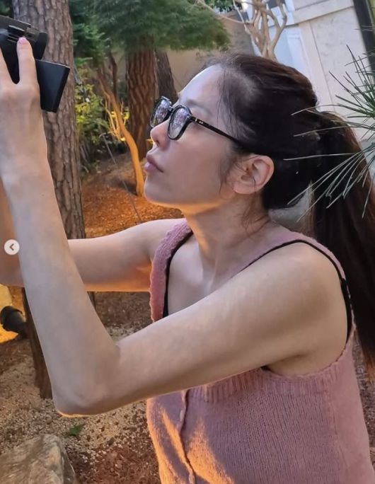 사진 속 고현정은 민낯에 가까운 수수한 모습으로 야외 정원에 앉아 카메라를 들고 무언가를 촬영 중이다. 얇은 민소매 니트와 헐렁한 하의 차림, 안경 너머 무심한 듯 진지한 눈빛까지.