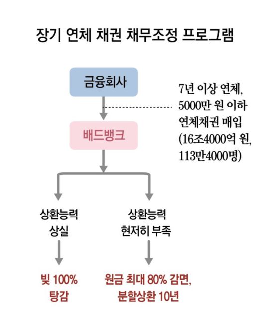 19일 금융위원회는 정부가 재정 4000억 원을 투입해 한국자산관리공사(캠코) 산하에 채무조정기구인 배드뱅크를 설치하고 7년 이상 연체된 5000만 원 이하의 개인(개인사업자 포함) 무담보채권을 일괄 매입해 소각하는 ‘장기 연체채권 채무조정 프로그램’을 발표했다. 배드뱅크는 부실 자산을 인수해 정리하는 전문 기관이다.