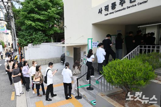 제21대 대통령 선거 사전 투표 첫날인 29일 서울의 한 사전투표소에서 유권자들이 투표를 하기 위해 길게 줄을 서고 있다. 류영주 기자 |