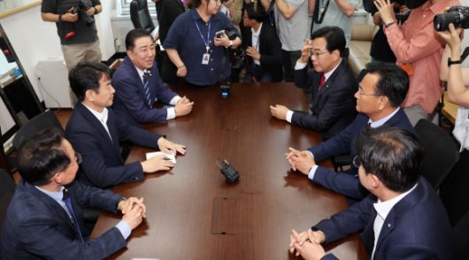 김병기 더불어민주당 당대표 직무대행 겸 원내대표와 송언석 국민의힘 원내대표가 18일 오후 서울 여의도 국회 민주당 원내대표실에서 추경안 논의 관련 회동을 하고 있다. 오른쪽 위부터 시계방향으로 송 원내대표, 유상범 의원, 박상혁 원내소통수석, 허영 원내정책수석, 문진석 원내운영수석, 김 당대표 직무대행. 2025.06.18. 뉴시스 |