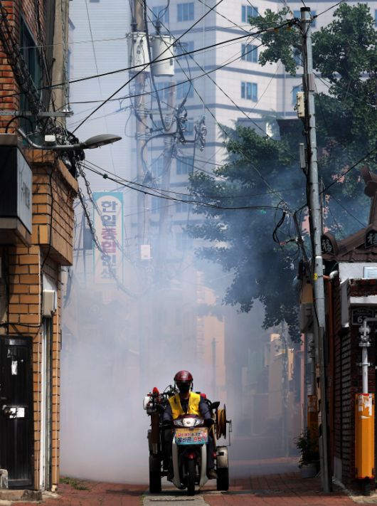모기 접근 금지! 방역 작업 중 - 19일 대구 중구 남산1동 일대에서 중구보건소 관계자가 여름철 모기 매개 감염병 대비 방역 작업을 하고 있다. 지자체들은 본격적인 더위와 장마 시작에 따라 비상방역체계를 강화했다. 대구 뉴시스 |