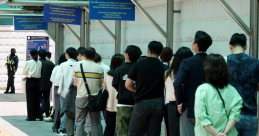 5일 오전 서울 종로구 주한 미국대사관 앞에서 시민들이 미국 비자심사를 받기 위해 길게 줄 서 있다. 2025.6.5 뉴시스 |