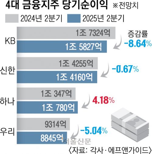 지난해에 이어 올해 1분기에도 사상 최대 실적을 이어가던 4대 금융지주의 순이익이 2분기 들어 감소할 것으로 전망됐다. 기준금리 인하기 금융당국이 가계대출 총량 관리 강도를 높이는 가운데 이재명 정부 초기 상생 금융에 대한 부담감도 가중될 것이란 분석이다.