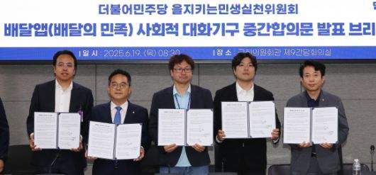 19일 국회에서 열린 배달앱 사회적 대화기구 중간 합의문 발표 브리핑에서 김범석(왼쪽부터) 우아한형제들 대표, 민병덕 더불어민주당 의원, 김진우 전국가맹점주협의회 공동의장, 김준형 공정한플랫폼을위한사장협회 공동의장, 이강일 민주당 의원이 서명한 합의문을 들어 보이고 있다. 연합뉴스 |